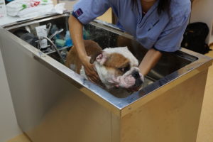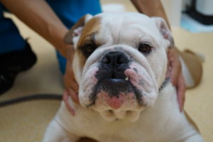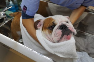 先月から皮膚炎治療のために当院で薬浴治療をしているブルドッグくん。