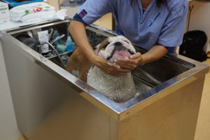 先月から皮膚炎治療のために当院で薬浴治療をしているブルドッグくん。